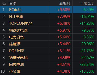板块方面,BC电池、锂矿、储能、复合集流体等板块涨幅居前,煤炭、港口、养殖等板块跌幅居前。