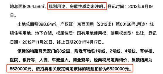 直至2023年10月的第四次挂牌,起拍价降至552万元,保证金也变成了110万元。竞买公告给出的理由是,经向税(务)局定向询价,反馈结果为552万元,依拍卖相关规定确定该标的物起拍价为552万元。