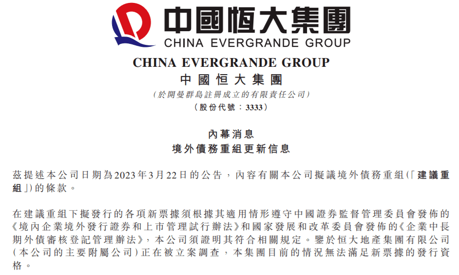 也就是说,恒大集团3月提出的重组方案中,均包括了发行新的票据。业内人士认为,恒大集团因被立案调查而无法发行新票据,也就意味着筹划半年之久的重组方案已经失败。