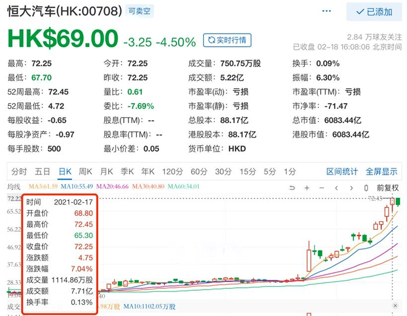 有过很短暂的巅峰。在恒大的财力,以及一系列合作资本的带动下,的股价也曾一路上涨,2021年初,市值一度超过7000亿港元。尽管当时的还没交车,但市场相信财大气粗的恒大能够复刻广州足球队般的成功。