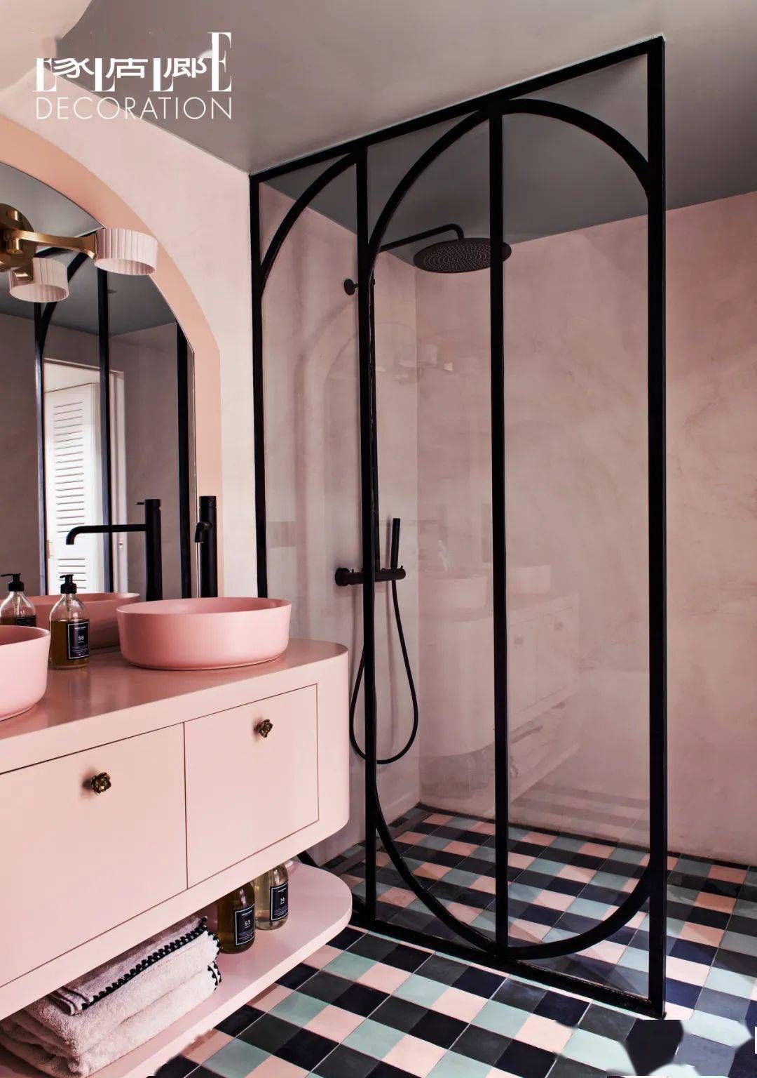 浴室,粉刷有Veneto涂料(Argile)的定制家具,安装了Kasia把 手(Anthropologie)。粉色水池(masalledebain.com),Triverde水龙头(Cristina&Ondyna)以及Jordi Blasi设计的Brahma壁灯。