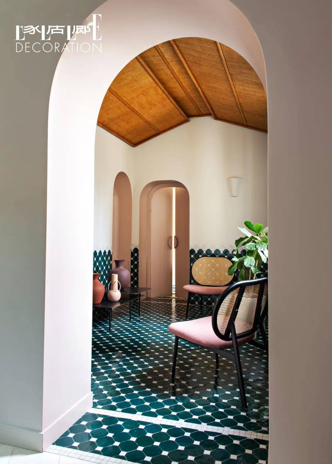 垂直和水平角度组成的动线,加上三层复式建筑内不同空间的视角变化,更显生动。石膏材质的拱门和有机形状的细木制品柔化了结构元素的线条。