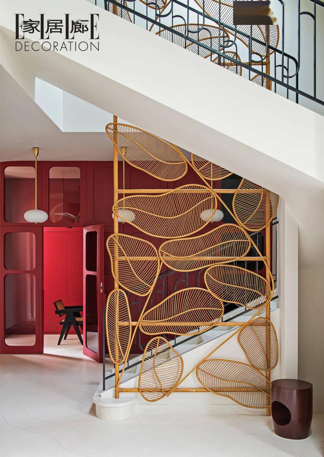 一进门,室内布置就令人仿佛置身于一个色彩斑斓、宽敞宏大的世界。楼梯一侧就像剧院的后台般,一块由细木工艺结合部分镶嵌玻璃所制成的红色漆木板将更衣间、盥洗室和书房隐匿其后。
