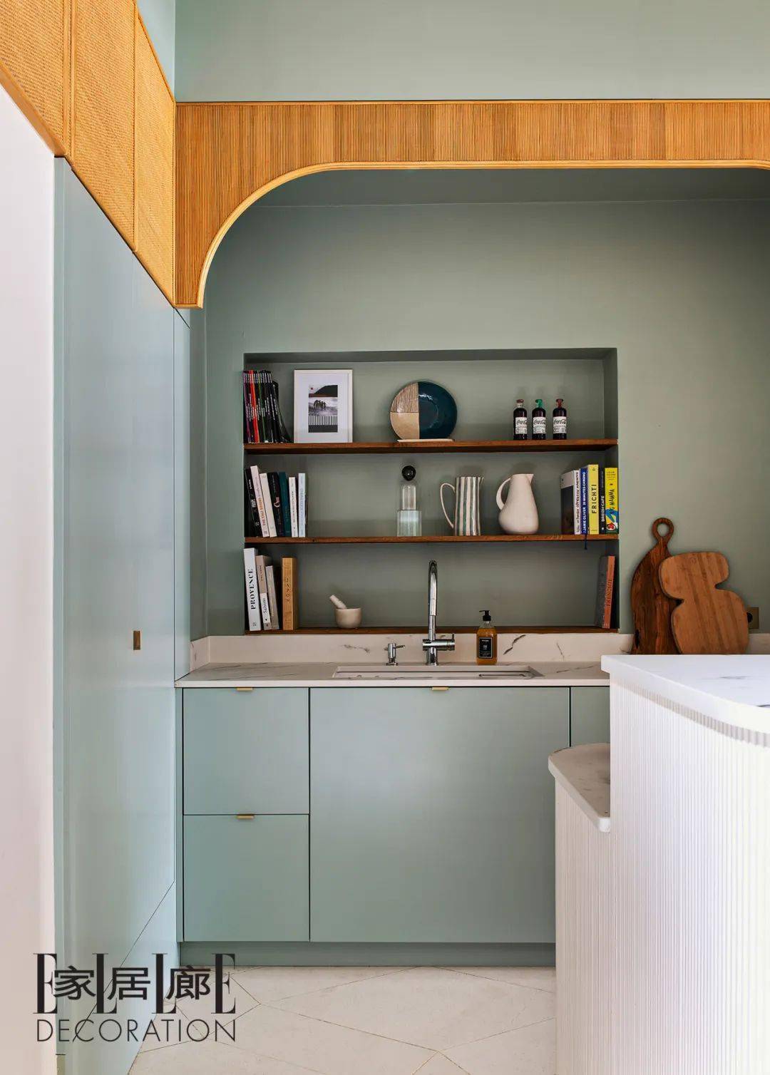 定制厨房采用了一系列中性色面板和GCG建筑事务所设计、François Passolunghi制作的藤制面板。兼具吧台功能的中央岛立面则使用白色漆面条痕木材,风格别致。