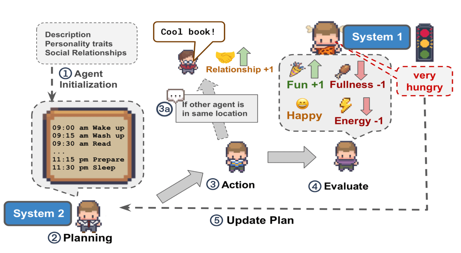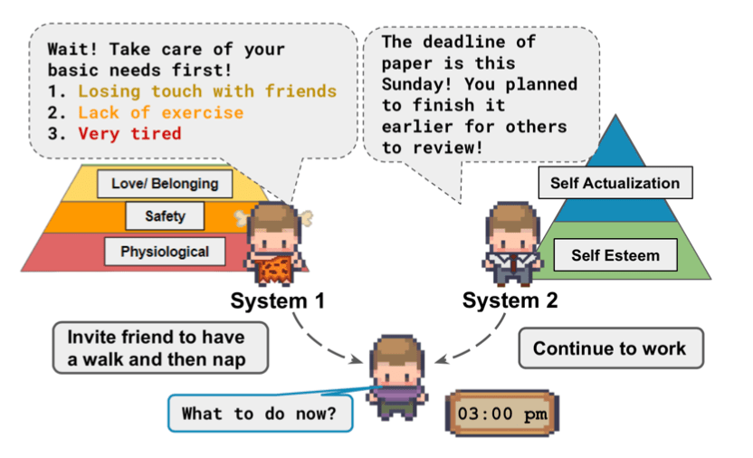 类人智能体在引导下既受到系统1思维的影响,以响应其内在条件,如基本需求,又受到涉及明确规划的系统2思维的引导。图片来源:《类人智能体:模拟类人生成智能体平台》