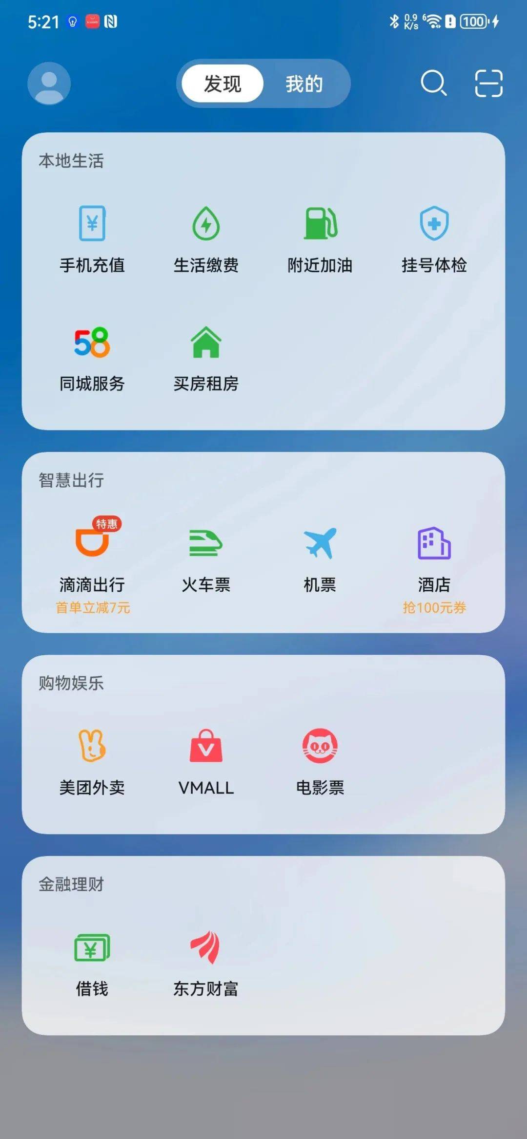 华为“负一屏”升级后,将机票、酒店、火车票、电影票、充值等常用服务以宫格形式直观地分区排列,目前有本地生活、智慧出行、购物娱乐、金融理财4大板块。