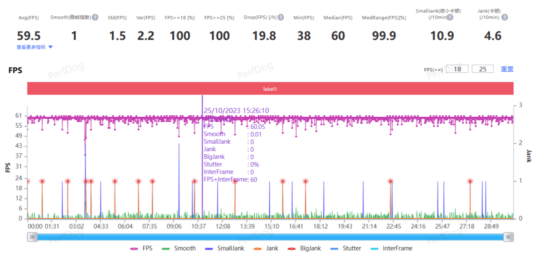 游戏这块儿,老朋友原神 30 分钟虚弥城跑图, 720p 分辨率默认全开极高画质,跑出了平均59.6 帧的帧率,全程基本不掉帧。