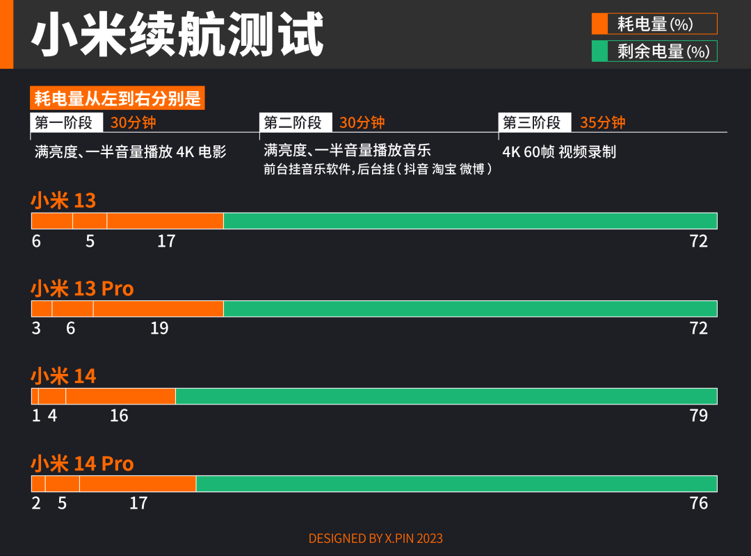 小米 14 系列用到的澎湃双芯,让今年的手机续航有了进一步的提升,像是观看 4K HDR 电影这样的场景,能做到基本不掉电。