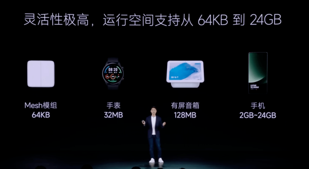 小到运行空间只有 64KB 的 Mesh 模组,大到 24GB 的手机平板设备,小米澎湃 OS 要做的,就是将生态内的设备全都兼容到一块儿,保障到同一个系统底层上,充分性能释放。