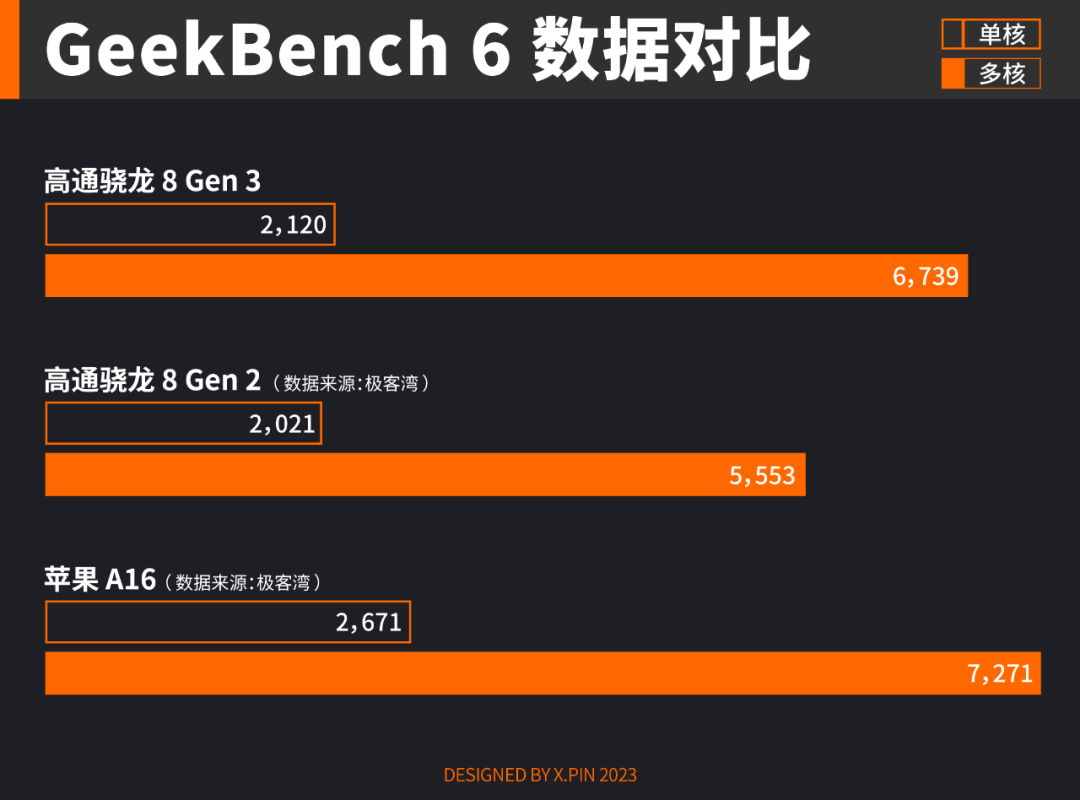 跑分环节,小米 14 的 8 Gen 3 拿下了 Geekbench 6 多核 6739、单核 2120 的高分,对比上一代 8 Gen2 多核进步较大,但和苹果的 A16 处理器还是有一定差距。
