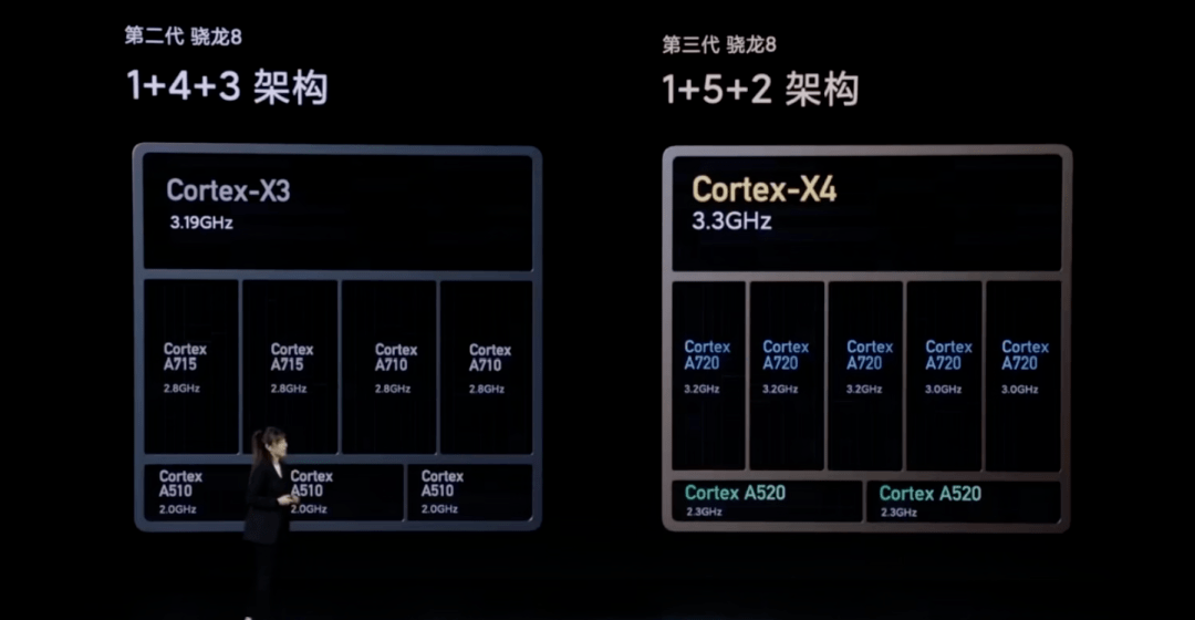 今年的高通骁龙 8 Gen 3 的 CPU 部分采用了全新的 1+5+2 ( 一个超大核心、五个大核、双能效核)的核心架构,超大核主频提升到了 3.3GHz。