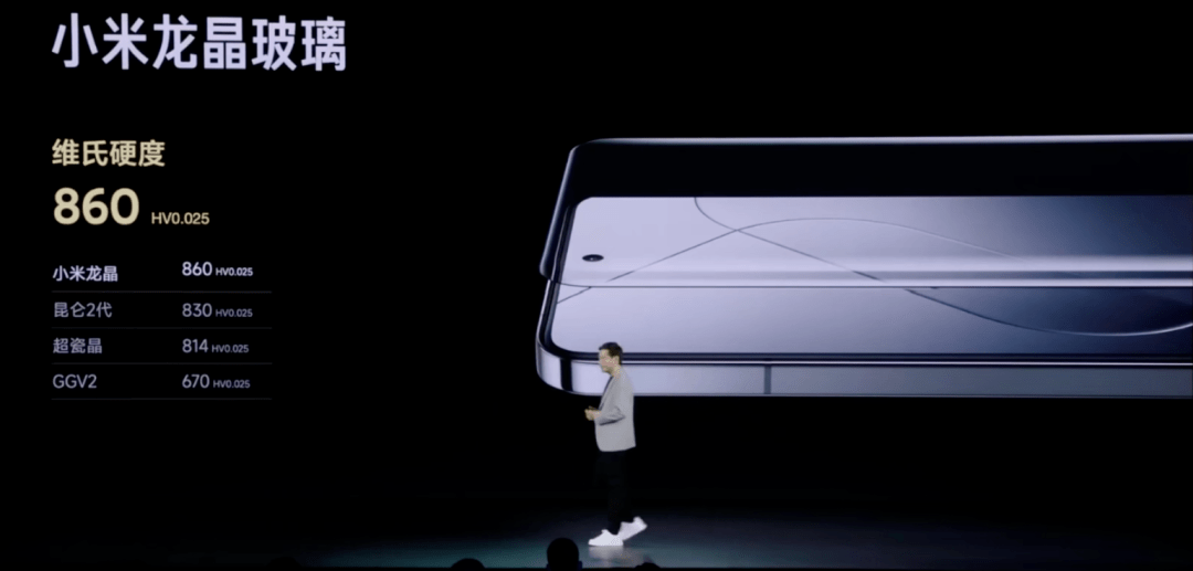 而 14 Pro 在屏幕上的另一个变化,是小米首次在手机上使用,维氏硬度达到了 860 HV0.025 (采用25g的试验力,保持10-15秒,得到硬度值为860)的自研龙晶玻璃。