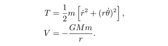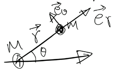 如图,假设有一个质量为 m 的天体微扰一个质量为 M 的天体转动。广义坐标仍取为径向距离 r 和角度 θ,体系的动能和势能分别可以写为