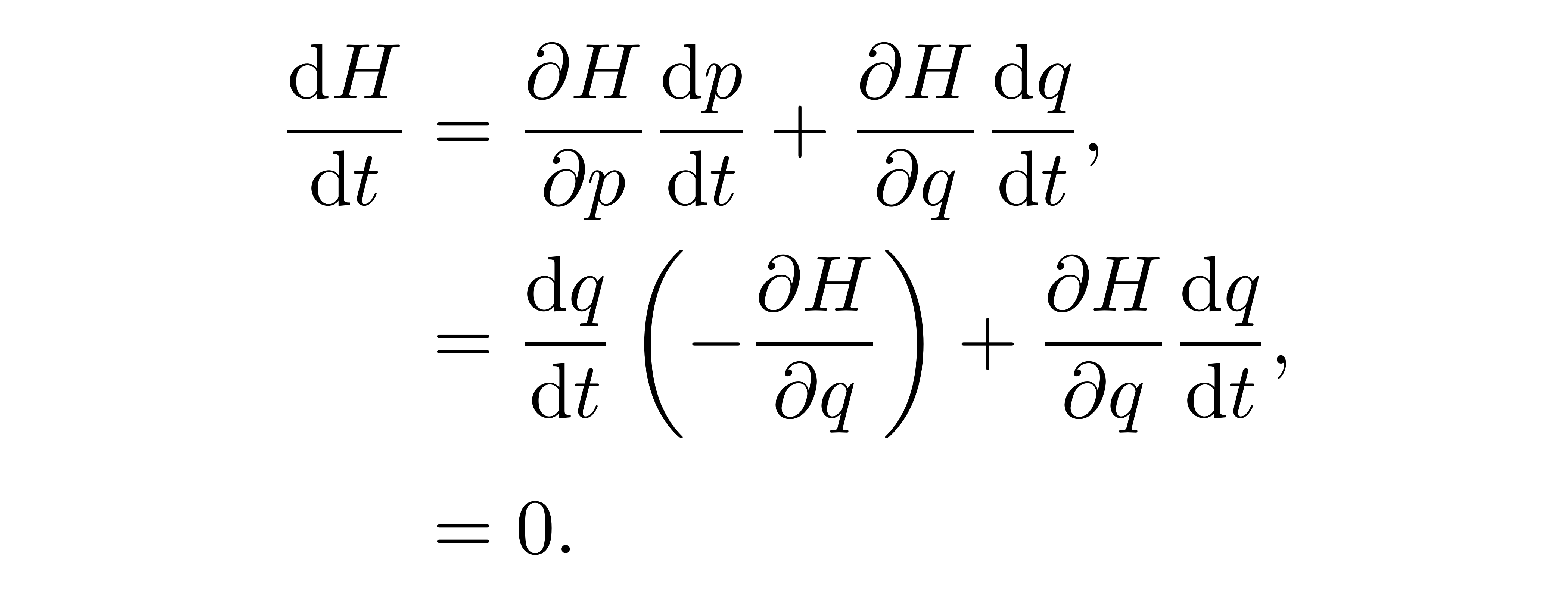 进一步,如果哈密顿量不显含时——即它对时间的依赖完全来自于两个变量对时间的依赖——时,可以证明,哈密顿量是系统的守恒量。同样是利用链式求导法则,