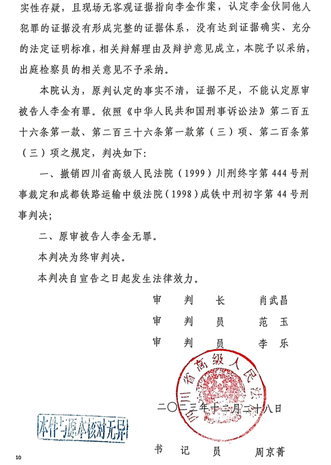 四川省高院认为,原判认定的事实不清,证据不足,不能认定原审被告人李金有罪。判决撤销四川省高级人民法院 (1999) 川刑终字第 444 号刑事裁定和成都铁路运输中级法院(1998)成铁中刑初字第 44 号刑事判决;原审被告人李金无罪。