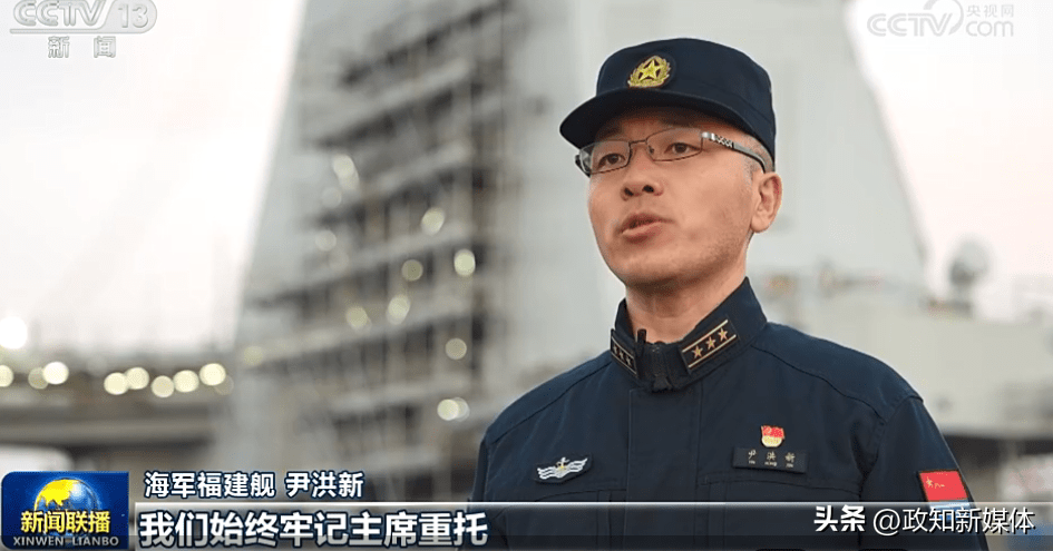 根据《新闻联播》画面,身着戎装、佩戴上校领章的海军福建舰尹洪新表示——