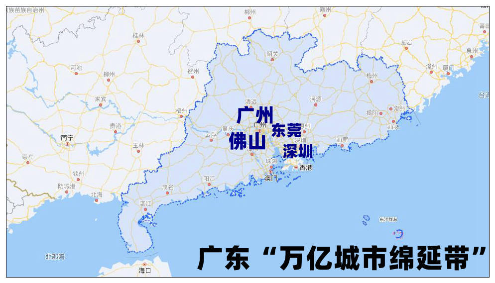 2021年,位于广、深之间的东莞地区生产总值达到10855亿元。它的入列,使广州、深圳、东莞和西面的佛山连成一片,广东的“万亿城市绵延带”成形。